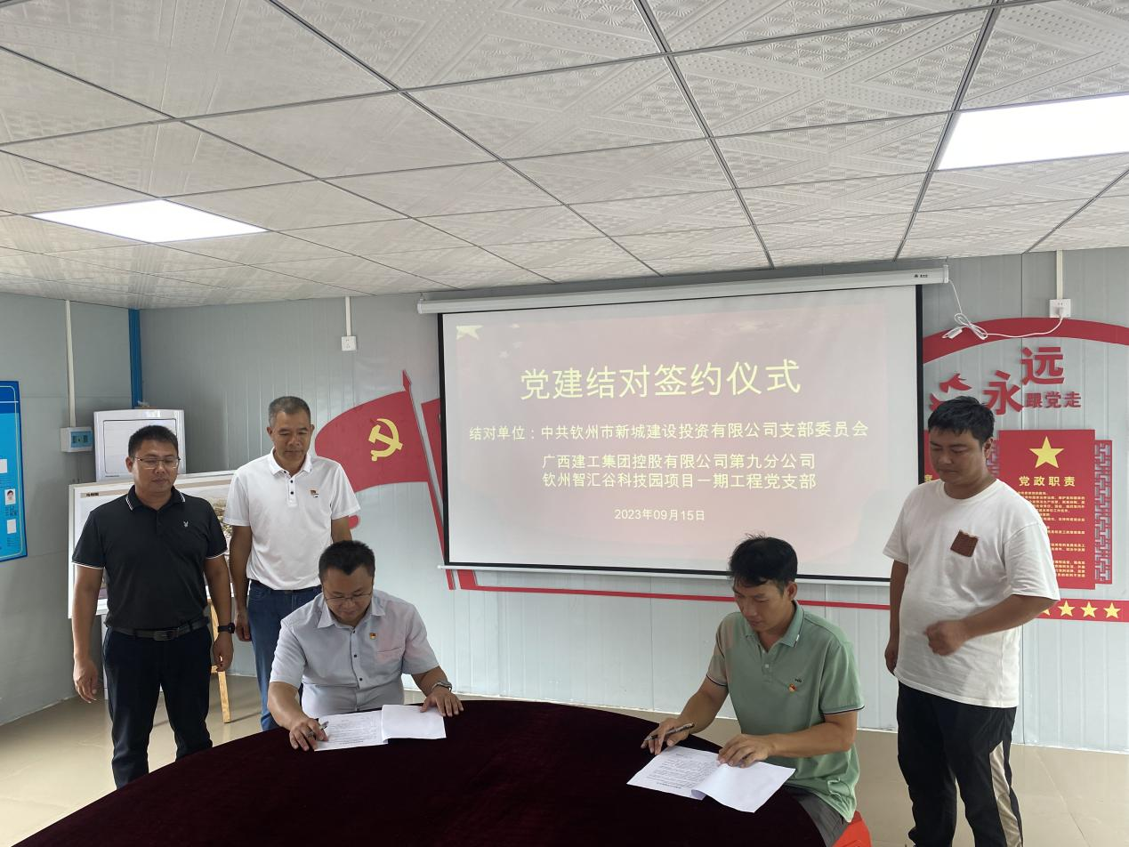 為充分發(fā)揮黨建引領(lǐng)作用,護航項目建設(shè)質(zhì)量、安全生產(chǎn),促進市重點項目建設(shè)提速增效,2023年9月15日,建投公司黨支部與廣西建工集團欽州智匯谷科技園項目一期工程黨支部舉行黨建結(jié)對共建協(xié)議簽約儀式。集團公司副總經(jīng)理、建投公司黨支部書記劉雙,欽州智匯谷科技園項目一期工程項目經(jīng)理劉鐘明等出席簽約儀式并簽約。