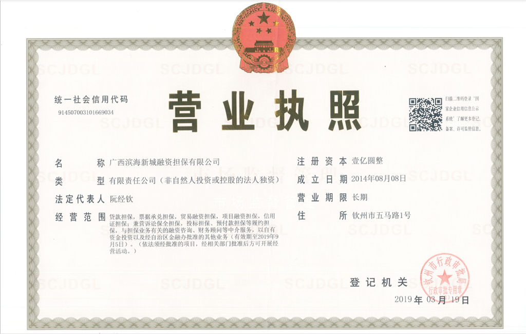 根據(jù)原廣西壯族自治區(qū)金融工作辦公室《廣西壯族自治區(qū)金融工作辦公室關(guān)于印發(fā)2018年全區(qū)融資擔(dān)保公司現(xiàn)場(chǎng)檢查工作方案的通知》(桂金辦融函〔2018〕106號(hào))的整改要求,我擔(dān)保公司立即展開(kāi)公司名稱的變更工作。經(jīng)欽州市行政審批局同意,于2019年3月19日完成公司名稱的變更并取得新?tīng)I(yíng)業(yè)執(zhí)照,變更后的名稱為“廣西濱海新城融資擔(dān)保有限公司&...