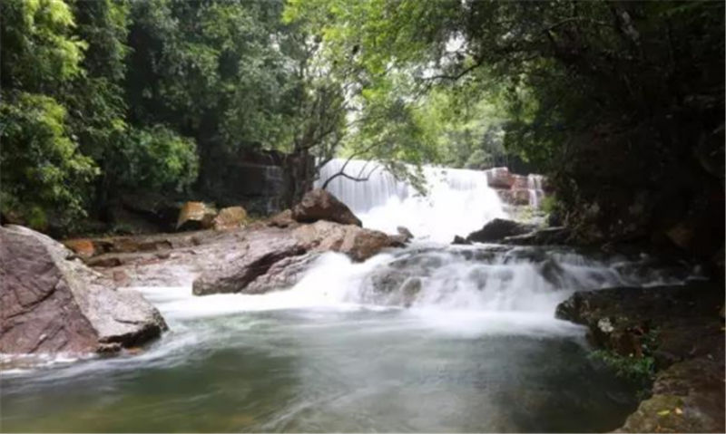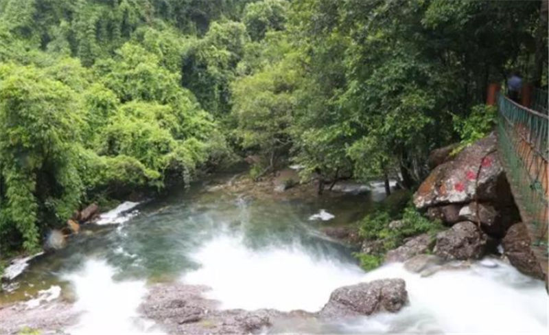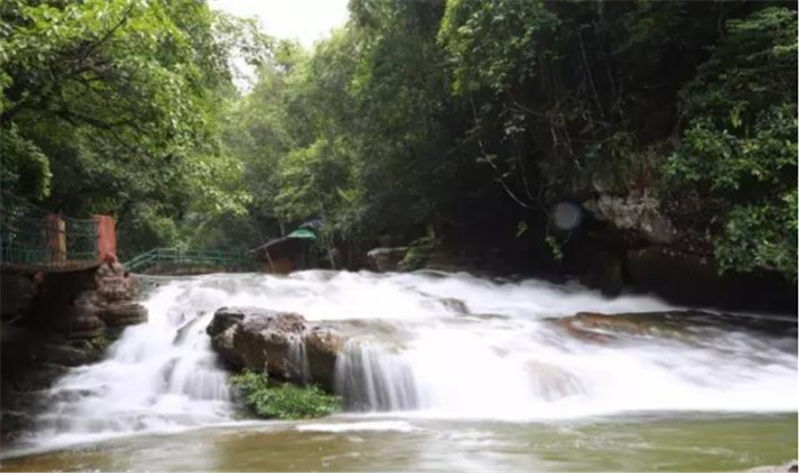 新月潭瀑布,猶如刀削一樣的從絕壁上沖天而下,周邊是成片石板,形如一彎新月,每當(dāng)雨后清風(fēng)佛過潭面,水波沿著弧形月亮圈圈蕩漾開來。