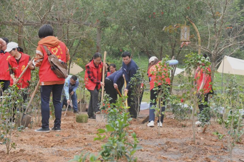 活動(dòng)現(xiàn)場(chǎng),全體人員積極投身于添綠行動(dòng)中,揮鍬鏟土、扶苗填土、提水澆灌,大家分工協(xié)作、相互配合、熱情高漲。經(jīng)過(guò)2個(gè)小時(shí)緊張的勞動(dòng),一排排新栽種的桂花、山茶花樹苗亭亭玉立,展現(xiàn)勃勃生機(jī),為初春的景區(qū)大地增添了絲絲活力。
