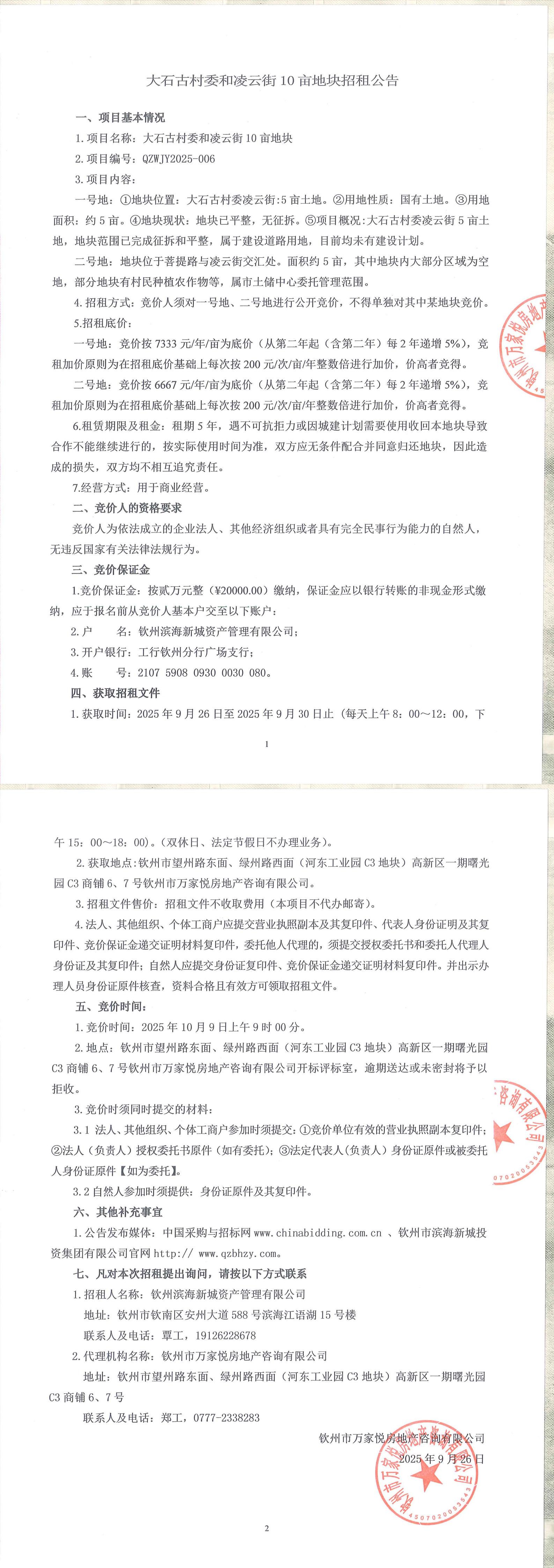 大石古村委和凌云街10畝地塊招租公告