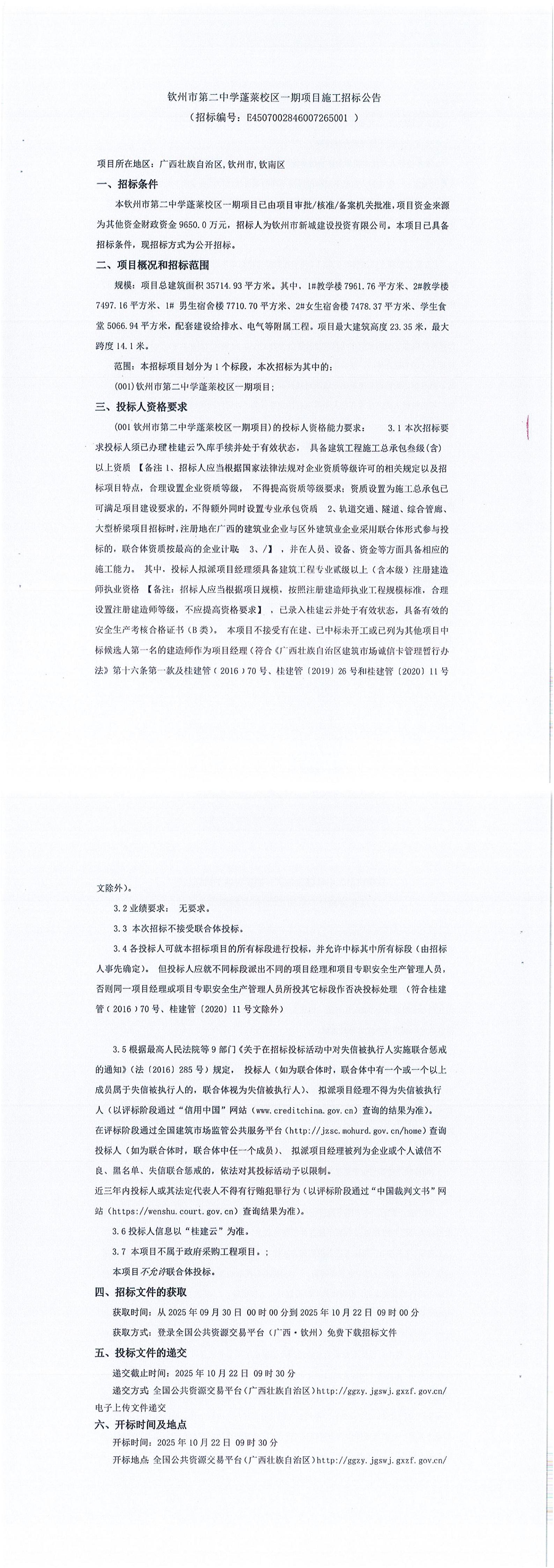 欽州市第二中學(xué)蓬萊校區(qū)一期項目施工招標(biāo)公告