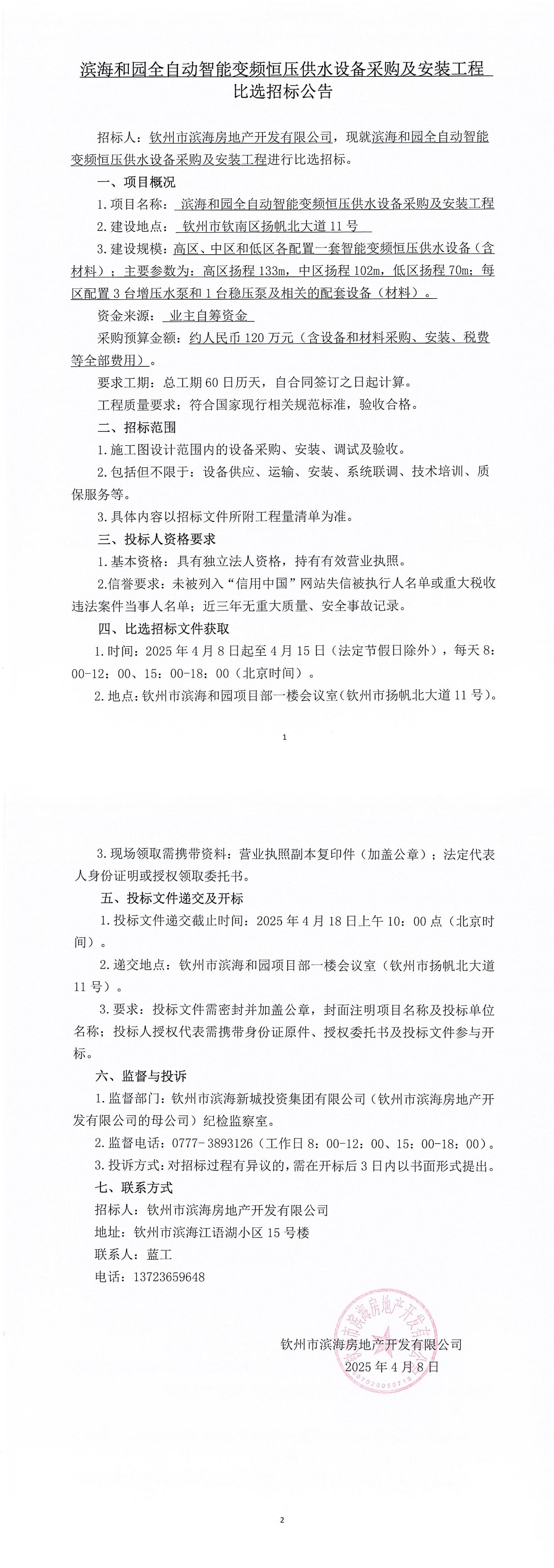 濱海和園全自動(dòng)智能變頻恒壓供水設(shè)備采購(gòu)及安裝工程比選招標(biāo)公告