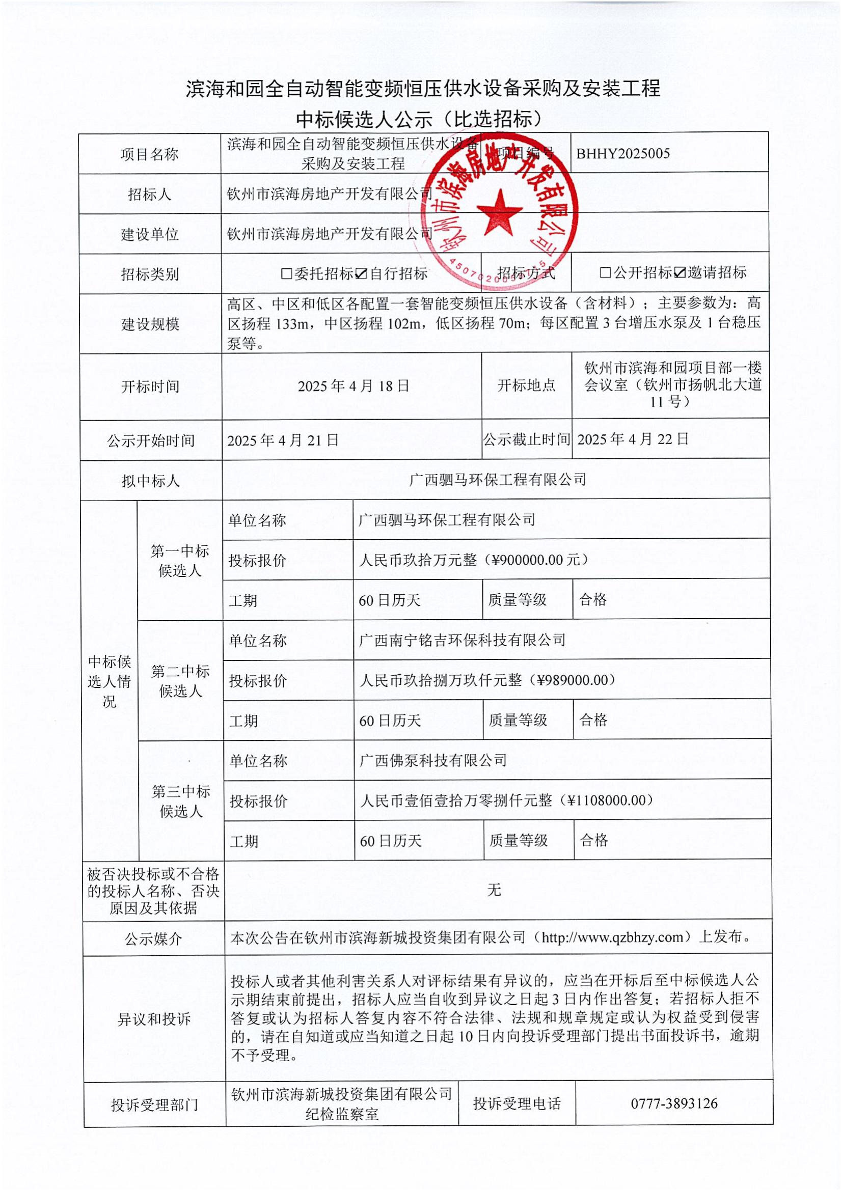 濱海和園全自動(dòng)智能變頻恒壓供水設(shè)備采購(gòu)及安裝工程中標(biāo)候選人公示(比選招標(biāo))