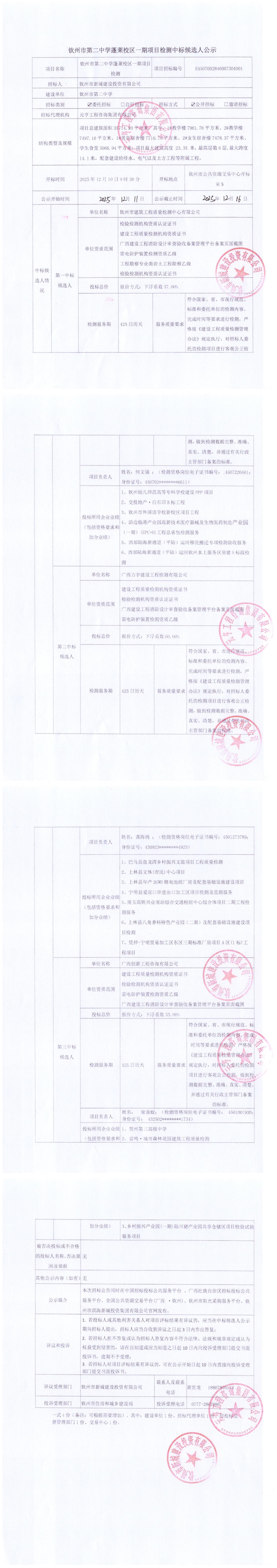 欽州市第二中學(xué)蓬萊校區(qū)一期項(xiàng)目檢測(cè)中標(biāo)候選人公示