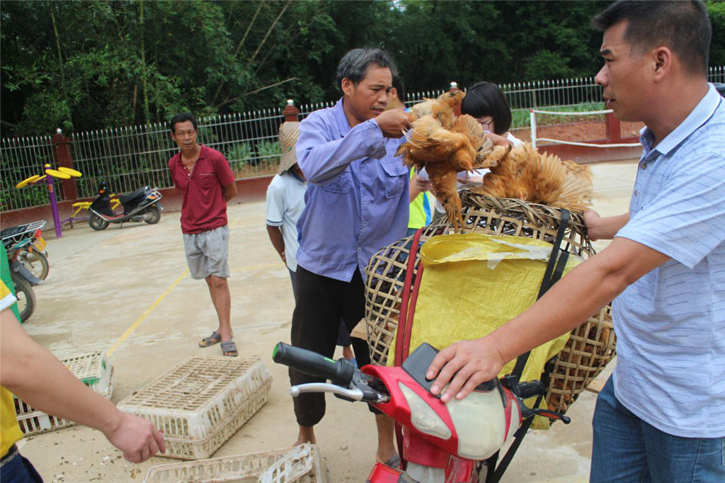 當(dāng)天上午,運(yùn)送雞苗的貨車從欽州市出發(fā),經(jīng)過1個小時(shí)的行程來到了靈山縣伯勞鎮(zhèn)新禾村公共服務(wù)中心,此時(shí),貧困戶們已經(jīng)滿心歡喜地到來,攜帶裝雞苗的籠子耐心等候著。現(xiàn)場,集團(tuán)公司副總經(jīng)理?xiàng)钚聴澰诠ぷ魅藛T的協(xié)助下,依次給貧困戶們發(fā)放了雞苗,楊新棟笑著對貧困戶說到:“大家領(lǐng)取到的雞苗平均每只重600克左右,雞苗在運(yùn)出養(yǎng)殖場之前都已閹割過了,具有生長發(fā)育快、抗病能力強(qiáng)、成活率高、市場效益好等特點(diǎn),大家回去后要管護(hù)好雞苗,讓扶貧雞真正為大家?guī)砻撠毾M?rdquo;,看著一只只活潑亂跳、帶著脫貧希望的雞苗裝進(jìn)了自家的籠子里,貧困戶們笑得合不攏嘴,心里樂開了花。