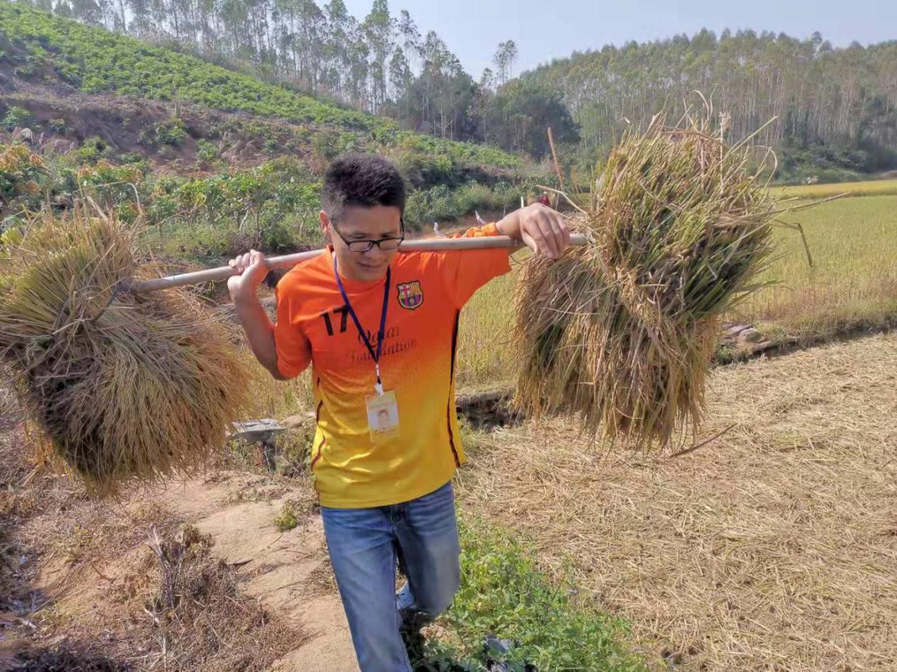 (圖為集團公司駐村工作隊員謝新平同志在田間幫助困難群眾將收割的稻谷挑回家)