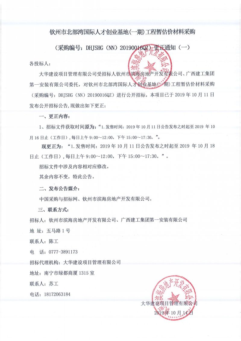 欽州市北部灣國際人才創(chuàng)業(yè)基地(一期)工程暫估價材料采購更正通知(一)