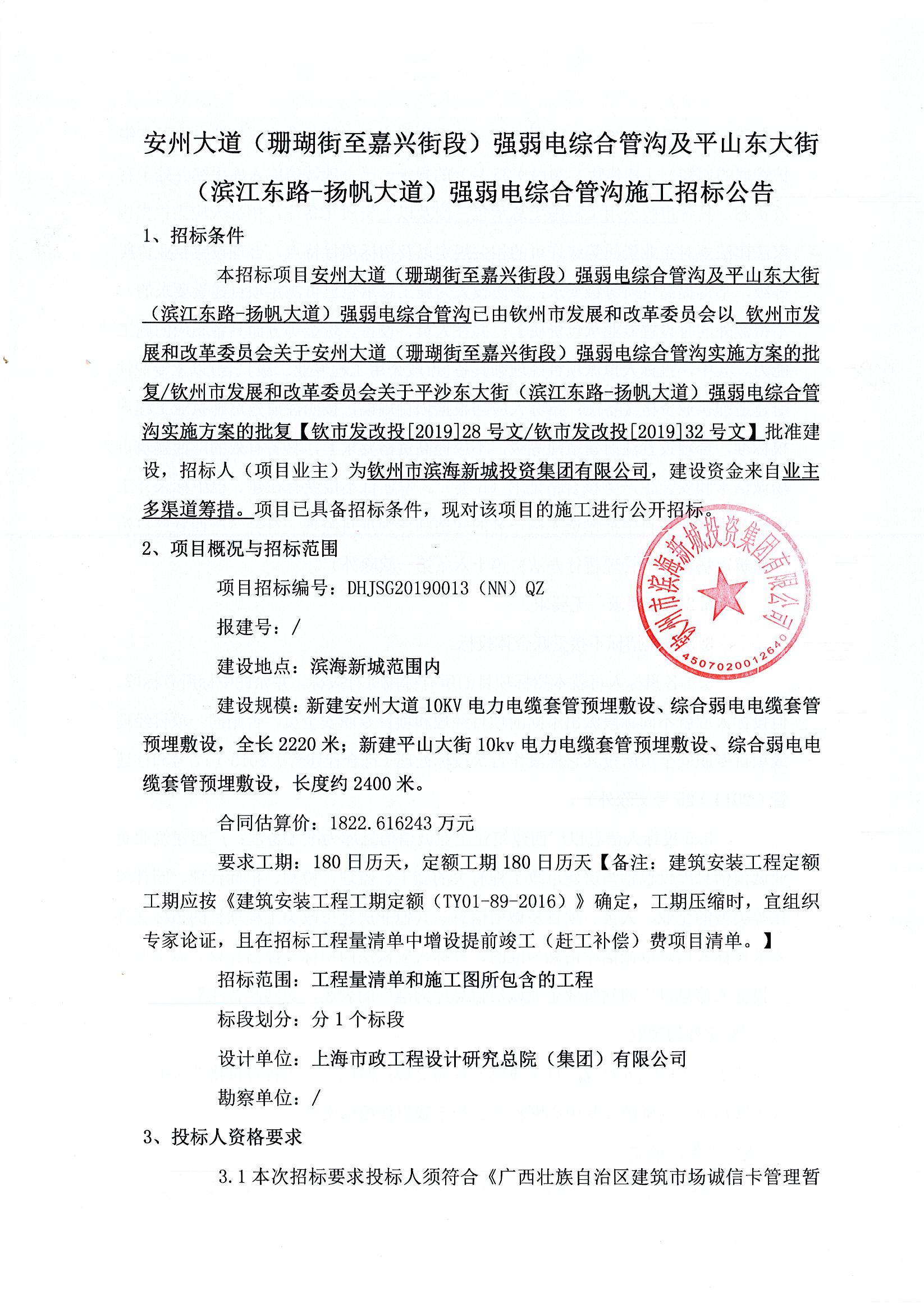 本招標項目 欽州市濱海新城嘉興街(嘉禾街-揚帆大道)道路工程及嘉興街(揚帆大道-安州大道)地下綜合管廊項目、欽州市公安局沙埠派出所項目、欽州市...
