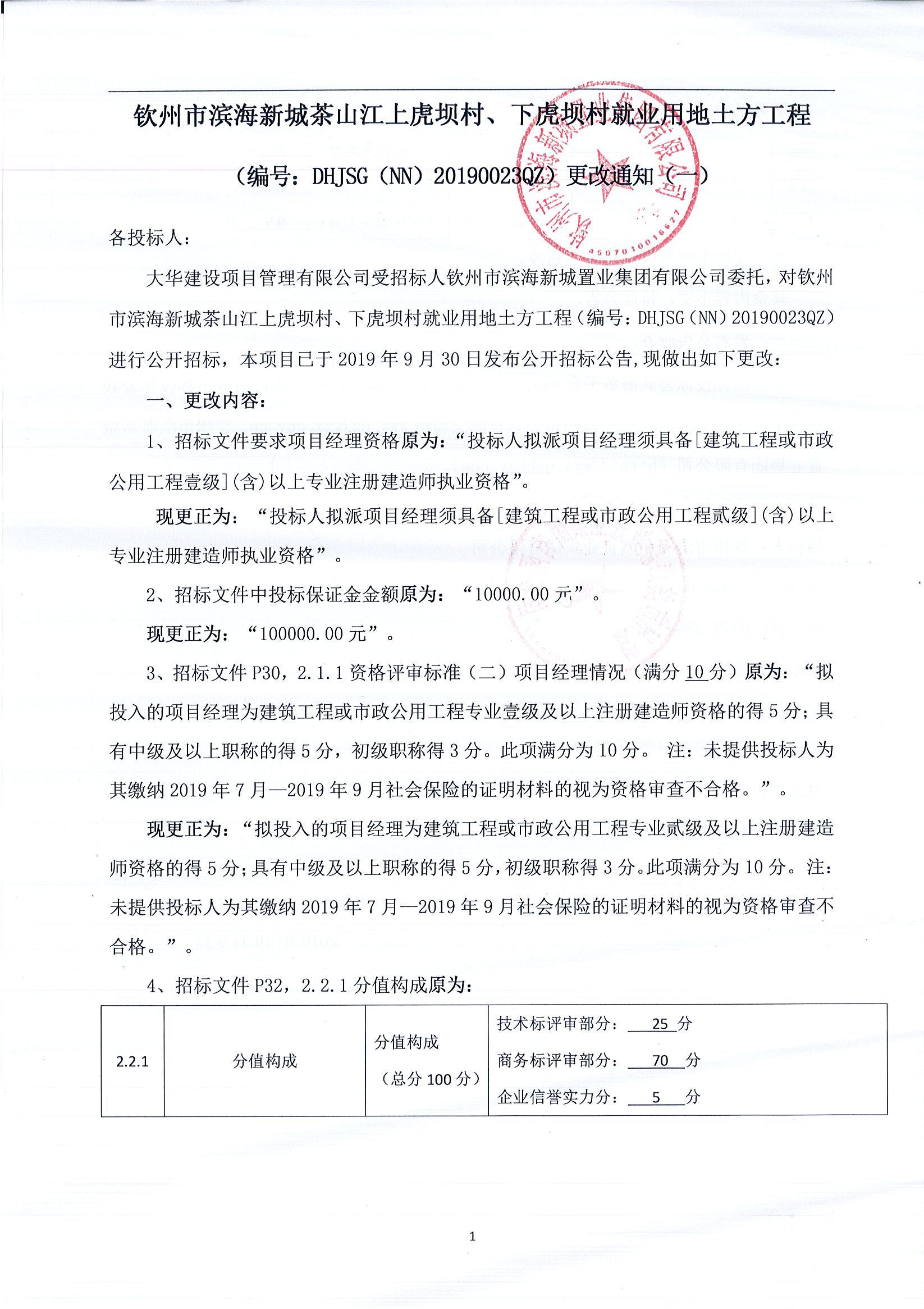 欽州市濱海新城茶山江上虎壩村、下虎壩村就業(yè)用地土方工程(編號:DHJSG(NN)20190023QZ)更改通知(一)