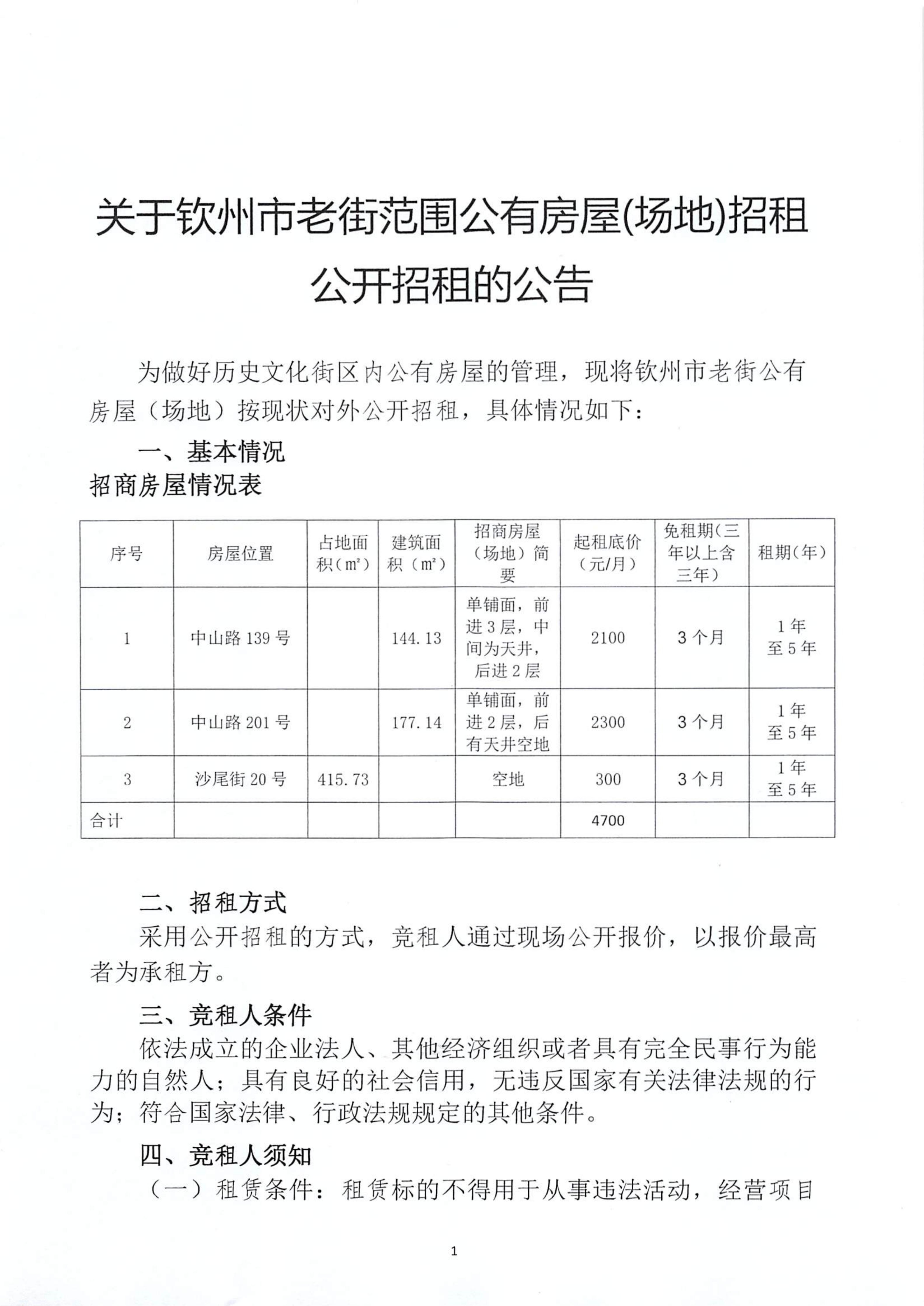 關于欽州市老街范圍公有房屋(場地)招租公開招租的公告(中山路139號、中山路201號、沙尾街20號)